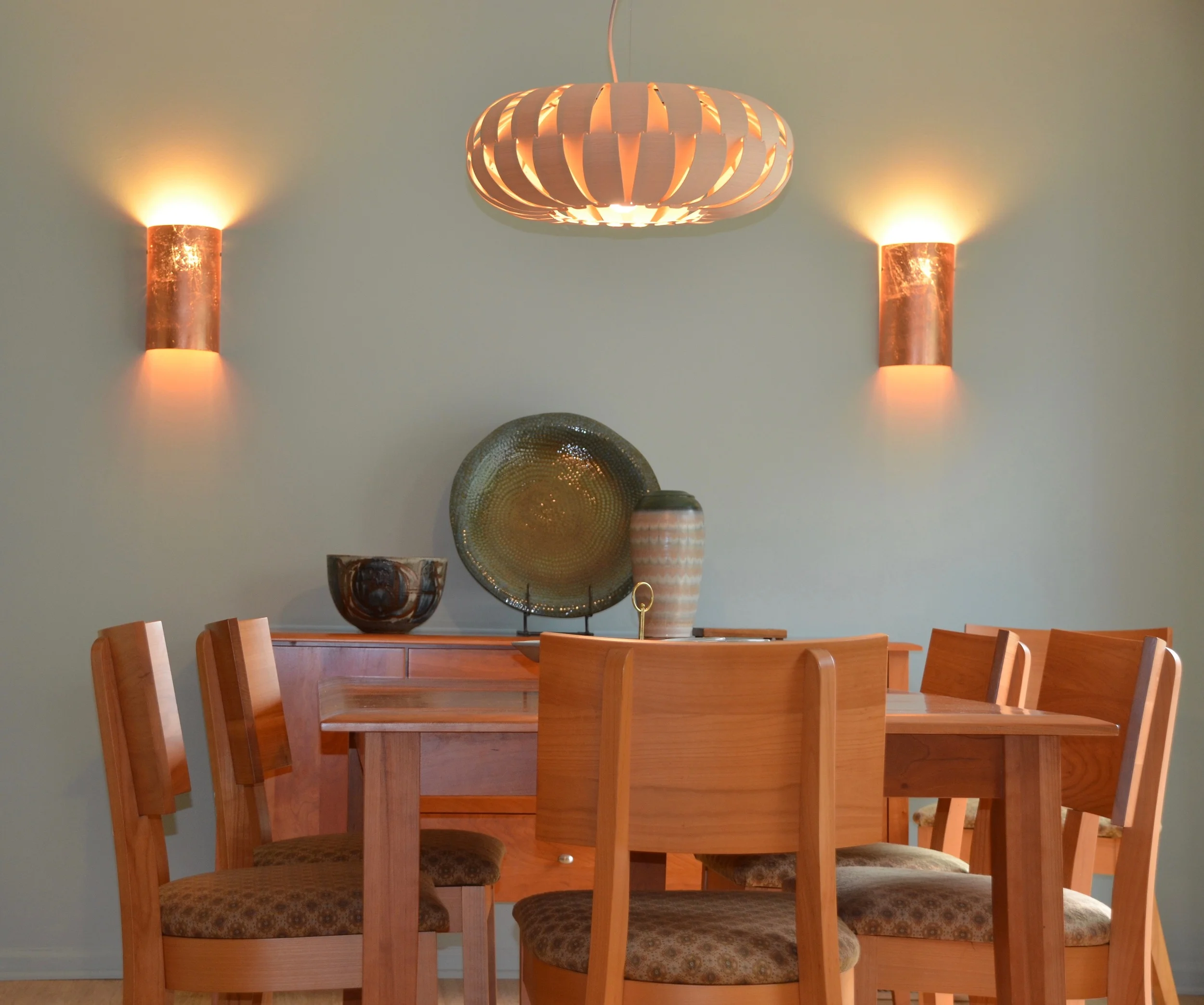 In the living/dining area, we traded carpeting for bamboo flooring, swapped light fixtures, and added sconces. Changing the room arrangement made tv viewing easier, and created an uninterrupted fireplace focal point . New paint colors and accessories added freshness and style. We were able to keep the homeowner's favorite sectional and cherry dining furniture, while making her living space seem new.